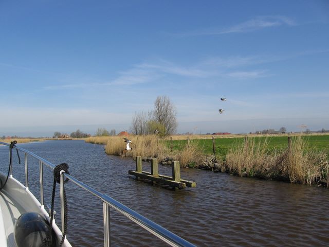 Wasservögel starten in den blauen Morgenhimmel von Friesland.