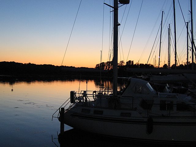 Mit leise tuckerndem Diesel sucht eine späte Yacht noch eine Box.