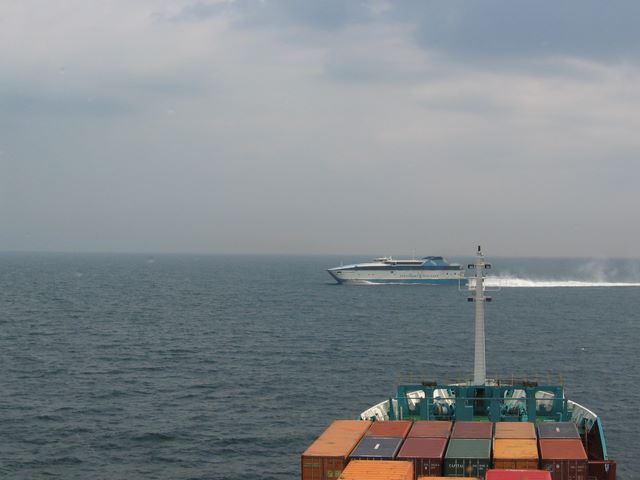 Frachtschiffreise -- Katamaranfähre der Bornholms Trafikken kreuzt unseren Kurs mit 38,5 Knoten